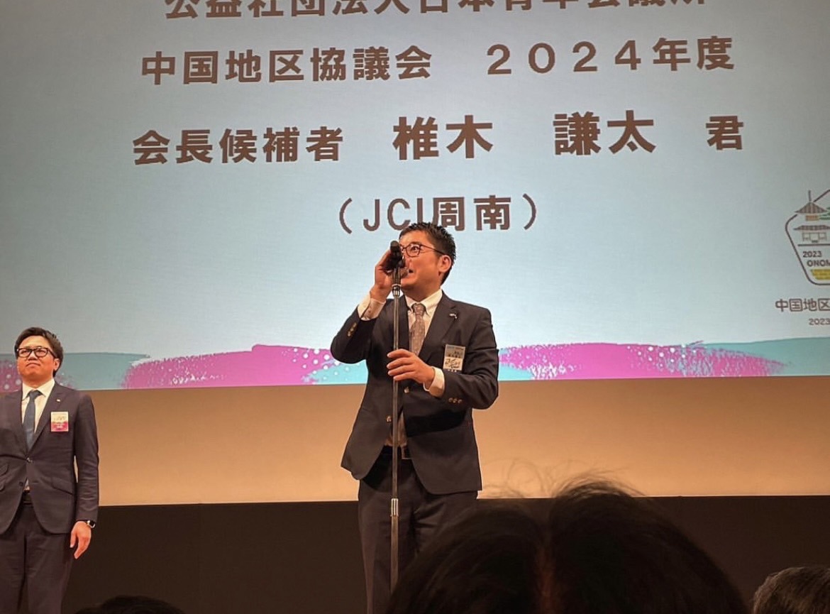 会議では、周南青年会議所に所属している椎木謙太君が、24年度中国地区協議会会長候補者として選出されました。